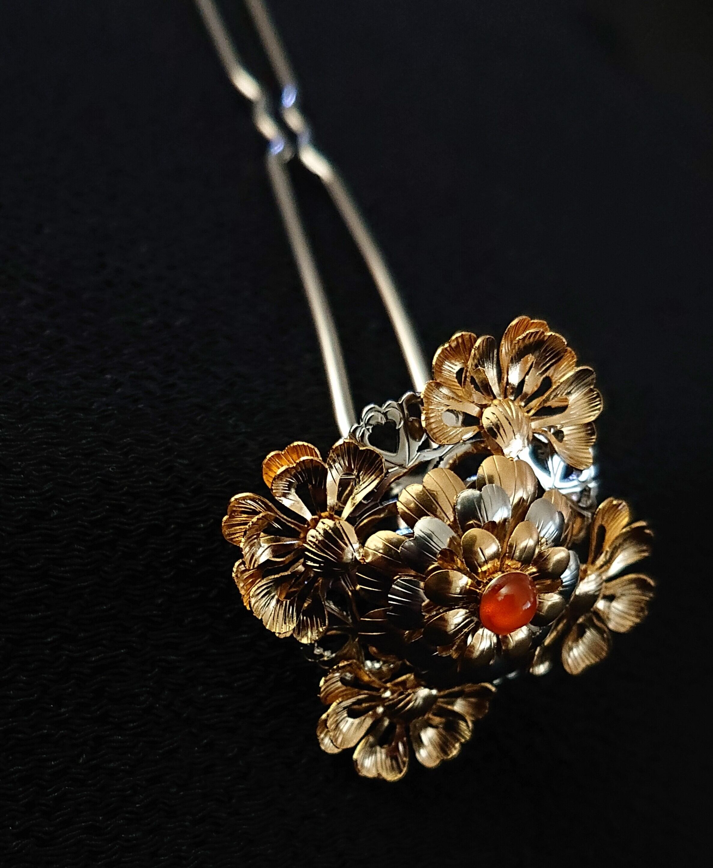 花を重ね、立体的で 一本で十分な存在感ですが、つまみ細工のかんざしやイミテーションフラワーのヘアアクセサリーと合わせてお使い頂くとより一層華やかになります。