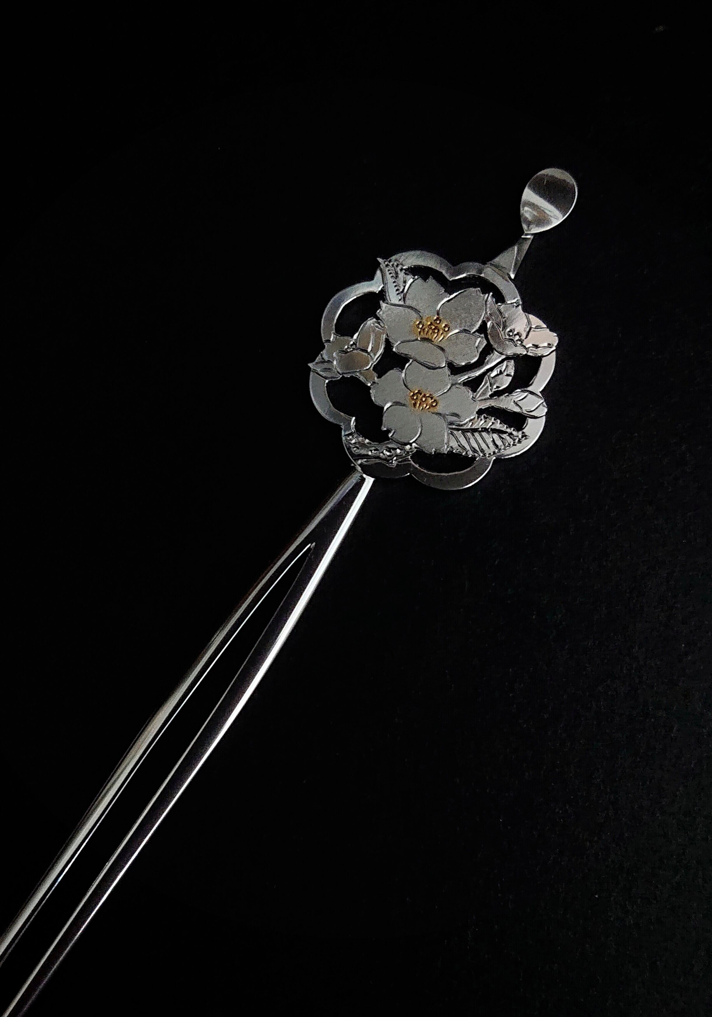 真ん中のさくら二輪は浮き立つように艶消しにしました。花芯には金メッキをしてあります。