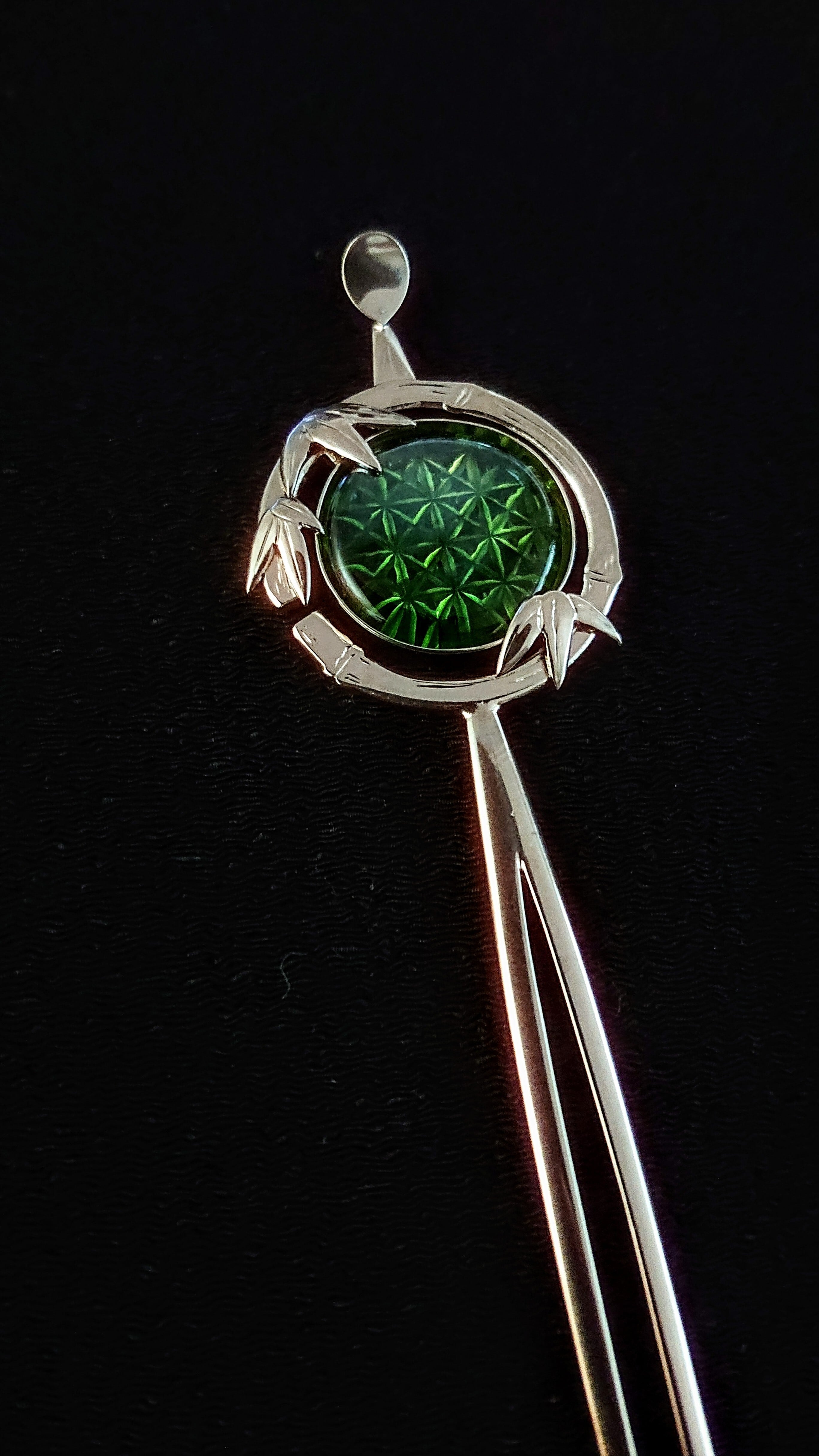 おはじきに美しい切り子を施したレコードキーパーを嵌めた「竹取物語かんざし」
